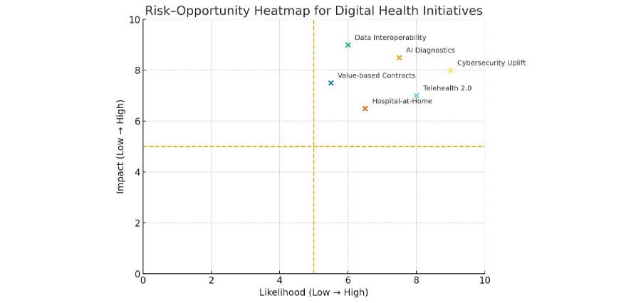 Figure 1. Risk–Opportunity Heatmap for digital health initiatives. It helps the board separate high-impact, high-likelihood projects from those to explore cautiously.